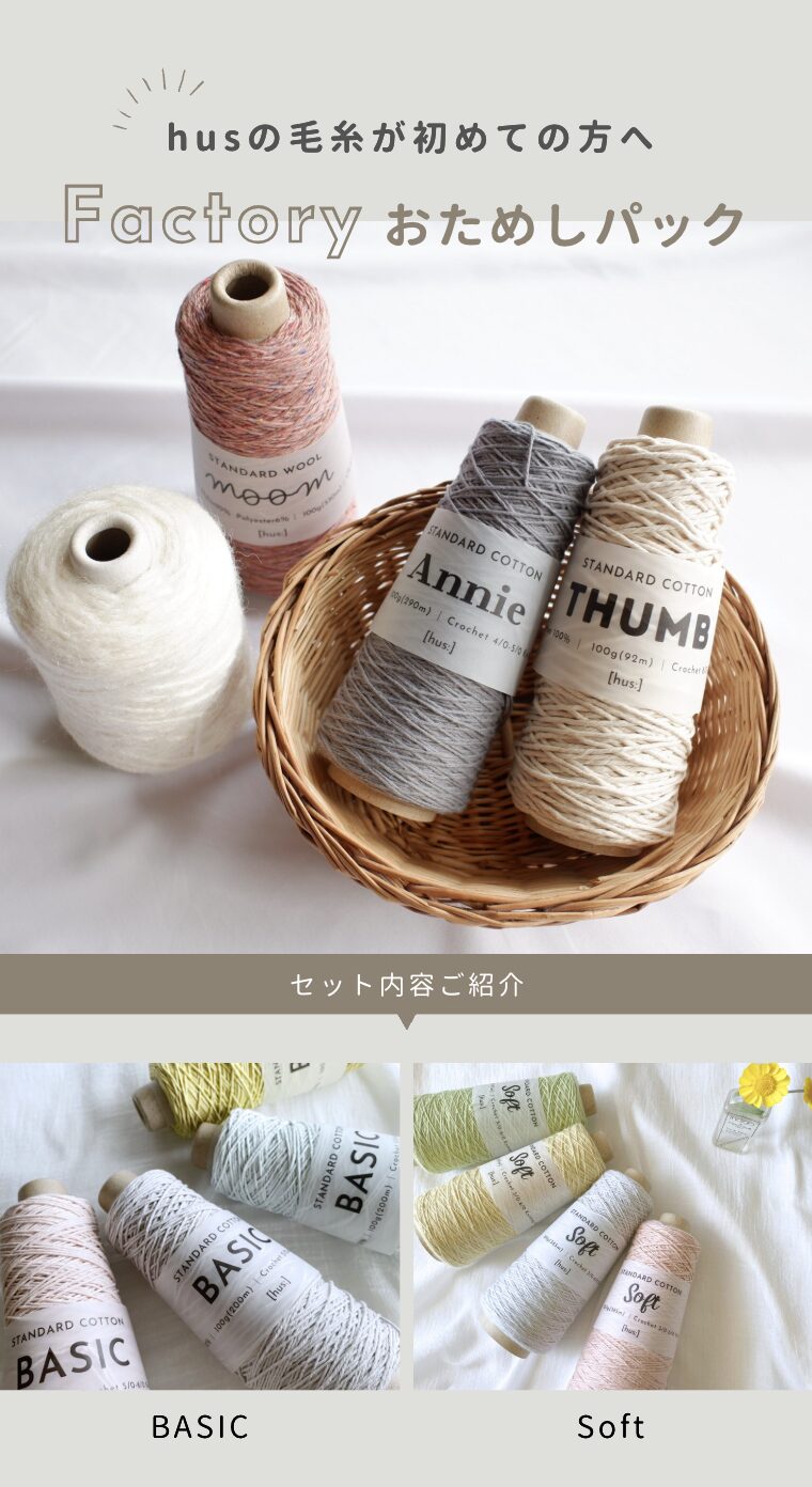 | 内容物 | ・[hus:] ビスケ 2本(149g) ・編み図(紙) ・オリジナルポストカード ・作家さんロゴステッカー |