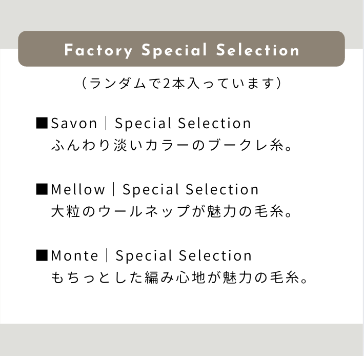 繊維が細くて光沢のあるアンゴラとあたたかくしなやかなファインラムに、軽くて丈夫なナイロンを組み合わせたファクトリー糸です。