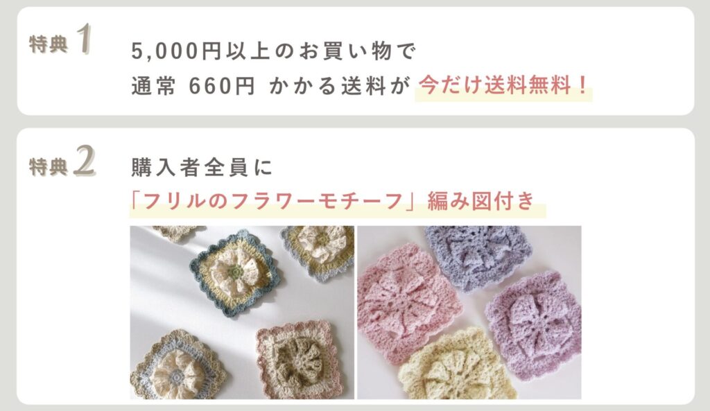 macaroniさんコラボ・アレンジも楽しめる「たっぷりフリルのフラワーモチーフ」編み図(ファイル付き)をプレゼント。