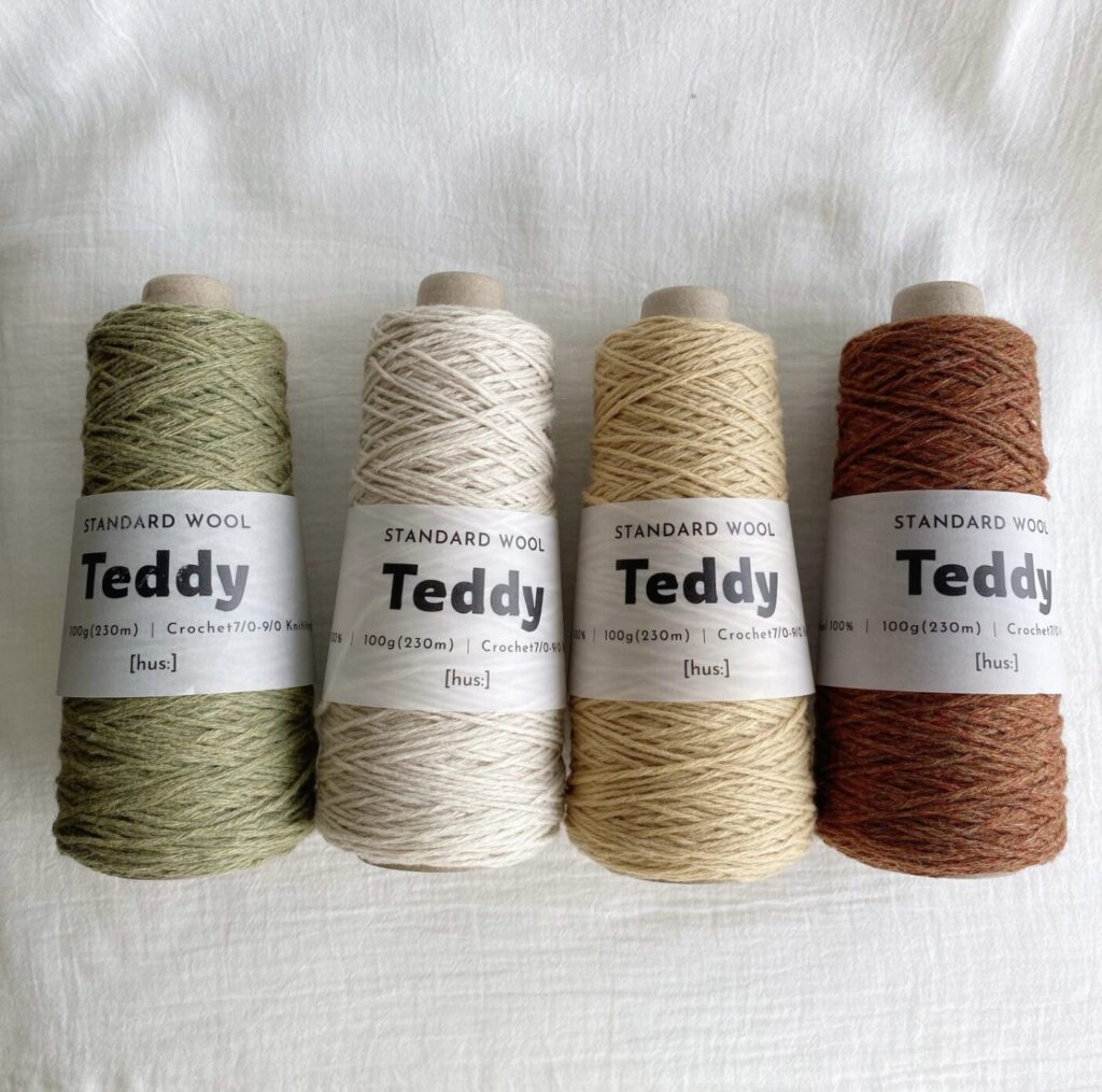 こちらのキットで使用する糸は「Teddy テディ」。国内紡績の高品質なメリノウール100%で、ふんわりとした膨らみと柔らかな風合いが魅力です。優しい色合いから深みのあるカラーまで揃っていて、シンプルな編み地をいっそう引き立ててくれます。指に触れる糸のすべりは心地よく、編み進めるたびに癒されることまちがいなしです。