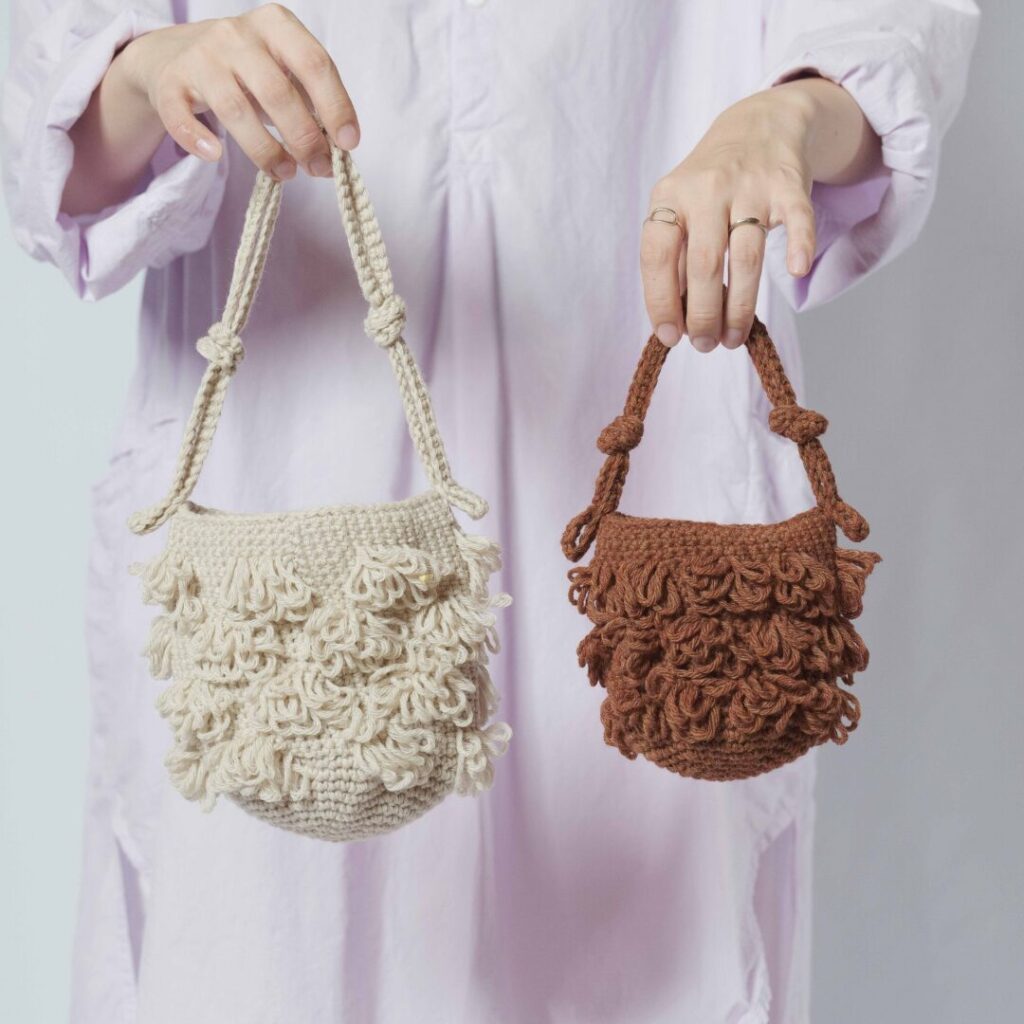 このキットは、1本で大小ふたつのサイズのバッグが編めます。手に持ったときの軽やかさや、ゆらゆらと揺れる表情は、持ち歩くだけで気分が弾みそうです。小ぶりなのに存在感があり、季節のコーディネートに遊び心を添えてくれるのも魅力ですね。インテリアとしてお部屋に置けば、ふんわりとした毛糸の質感が部屋の雰囲気をやさしくしてくれます。ちょっとしたお出かけに必要なものを入れても、かわいらしくまとまるので、つい毎日手に取りたくなります。