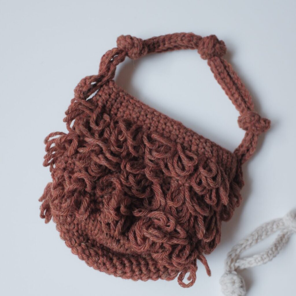 ふわふわと揺れるリング編みが、まるでムーミンに登場する“ニョロニョロ”のよう。バッグなのに、どこか生きもののような、かわいらしい存在感を放っています。