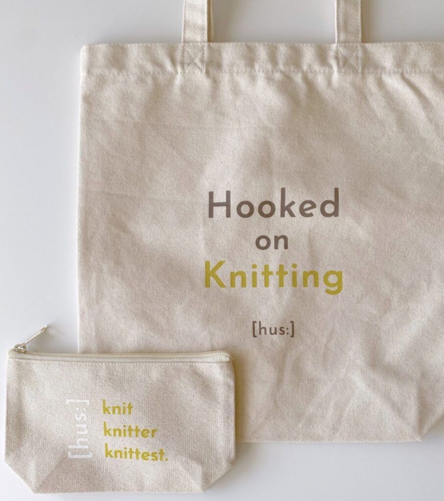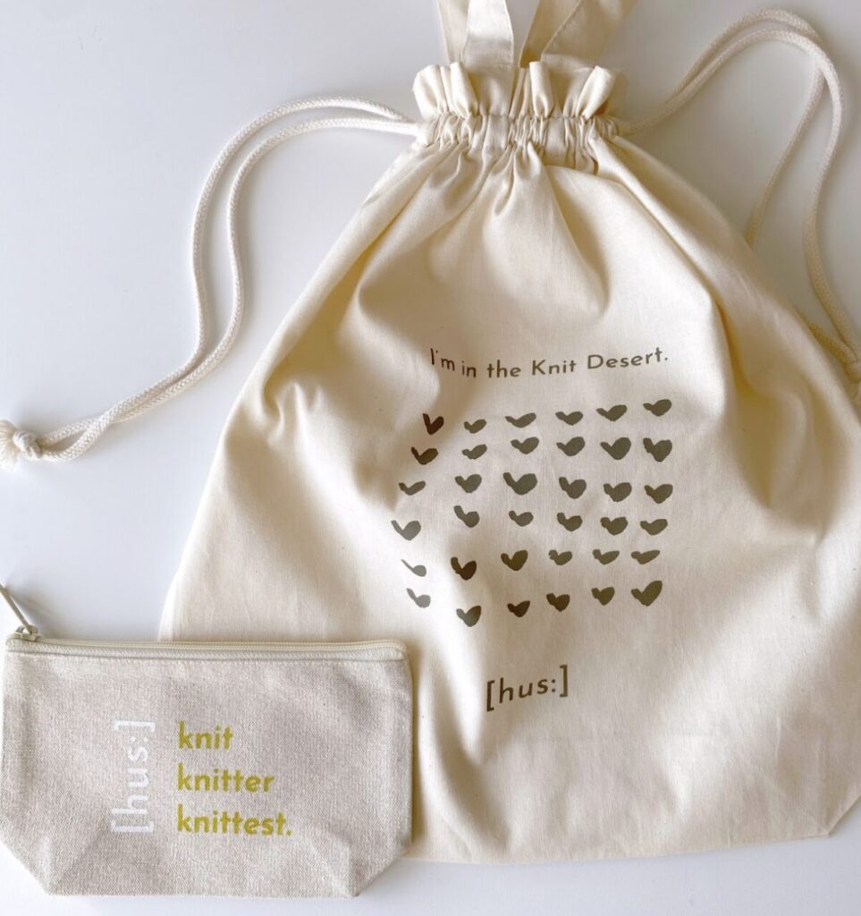 ノベルティには、毛糸がたっぷり入る「I’m in the Knit Desert.(編みもの砂漠にいます)」巾着バッグに、編み物の小物入れにも使えるキャンバスポーチなど、ふだん使いにもぴったりのアイテムが入っているのもうれしいところ。