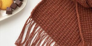巻いても肩にかけても結んでも良しなデザインだそうで、ぜひ違う色や毛糸でも編んで、色々と着こなしを楽しんで欲しいです。