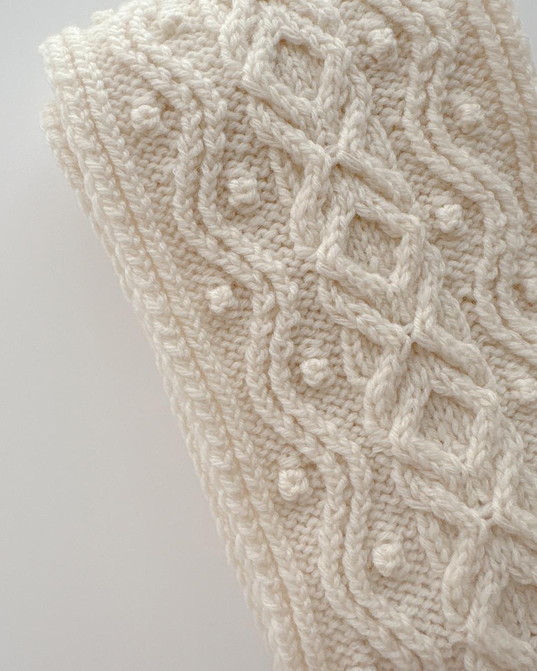 このゆるやかな曲線が、かわいらしいデザインの中でもアラン模様の美しさを引きたてています。