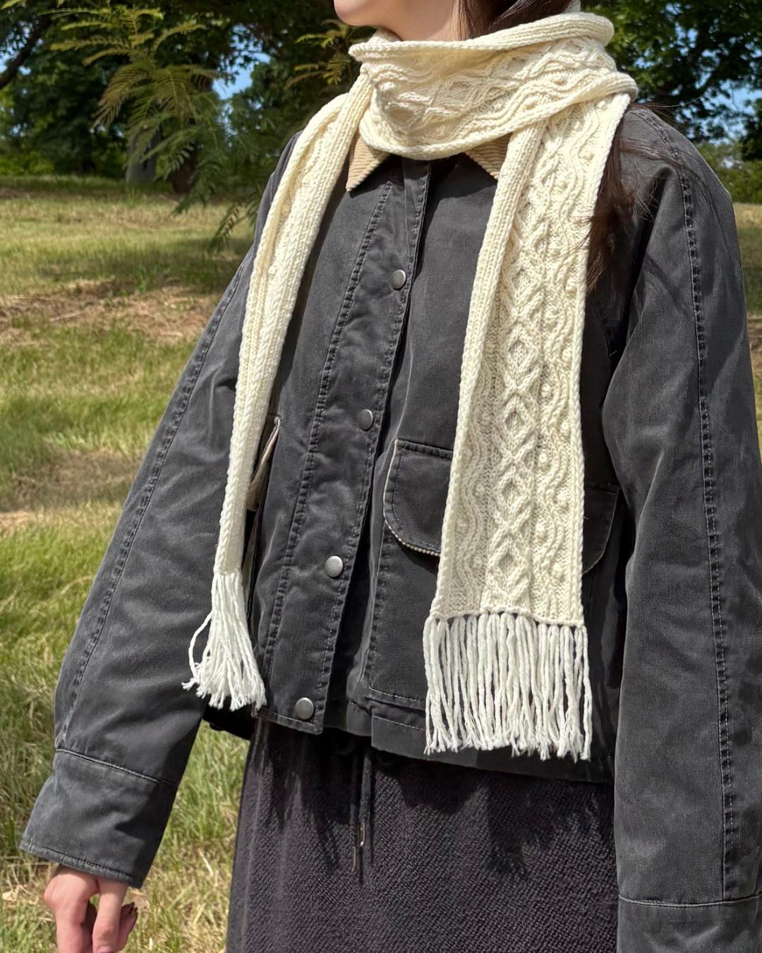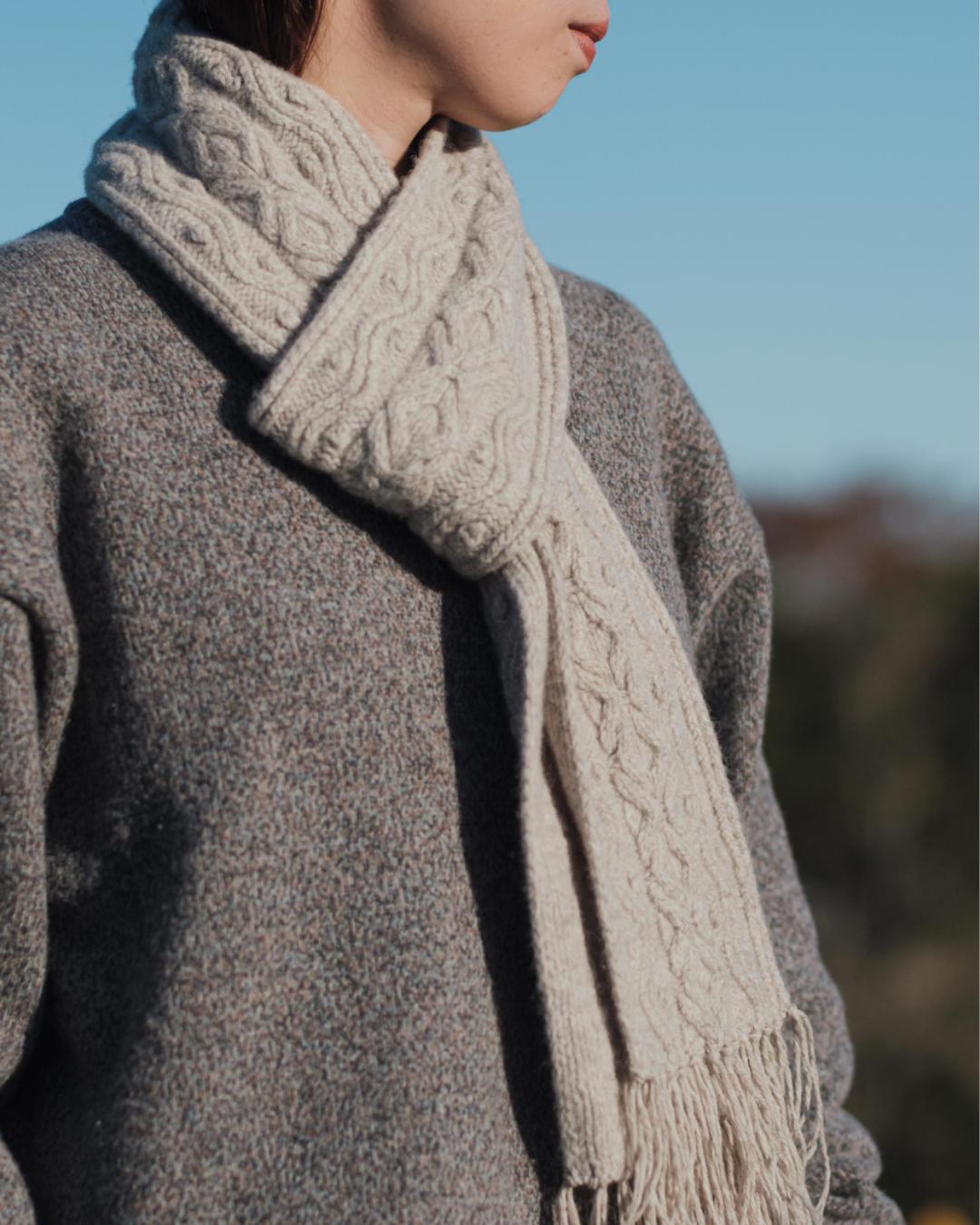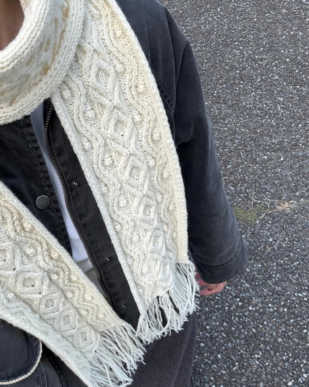 ナローマフラーはかわいさもありながら、昔ながらのアラン模様の美しさもあります。