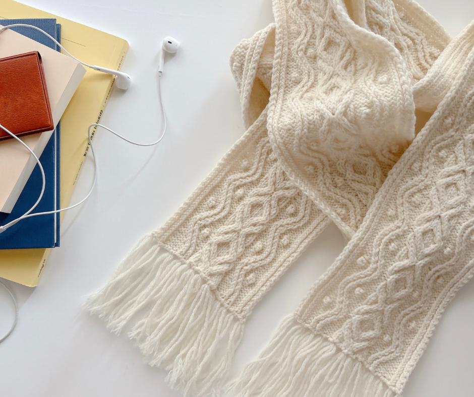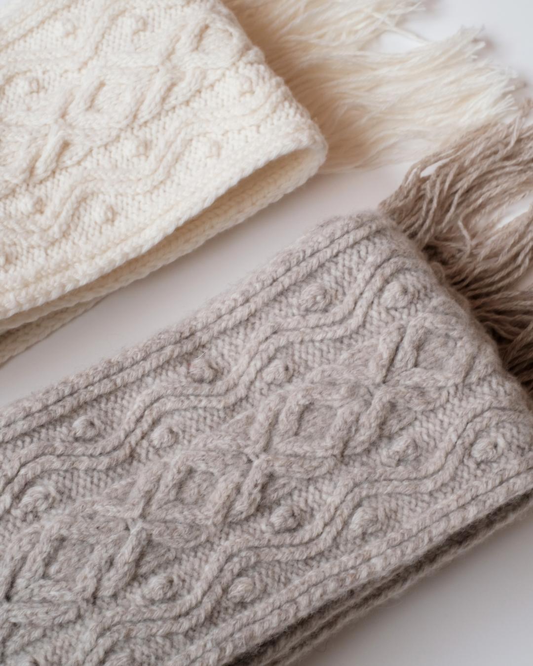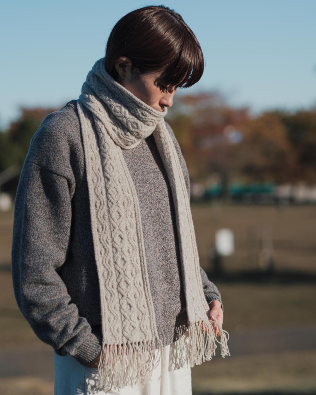 ナローマフラーはかわいさもありながら、昔ながらのアラン模様の美しさもあります。