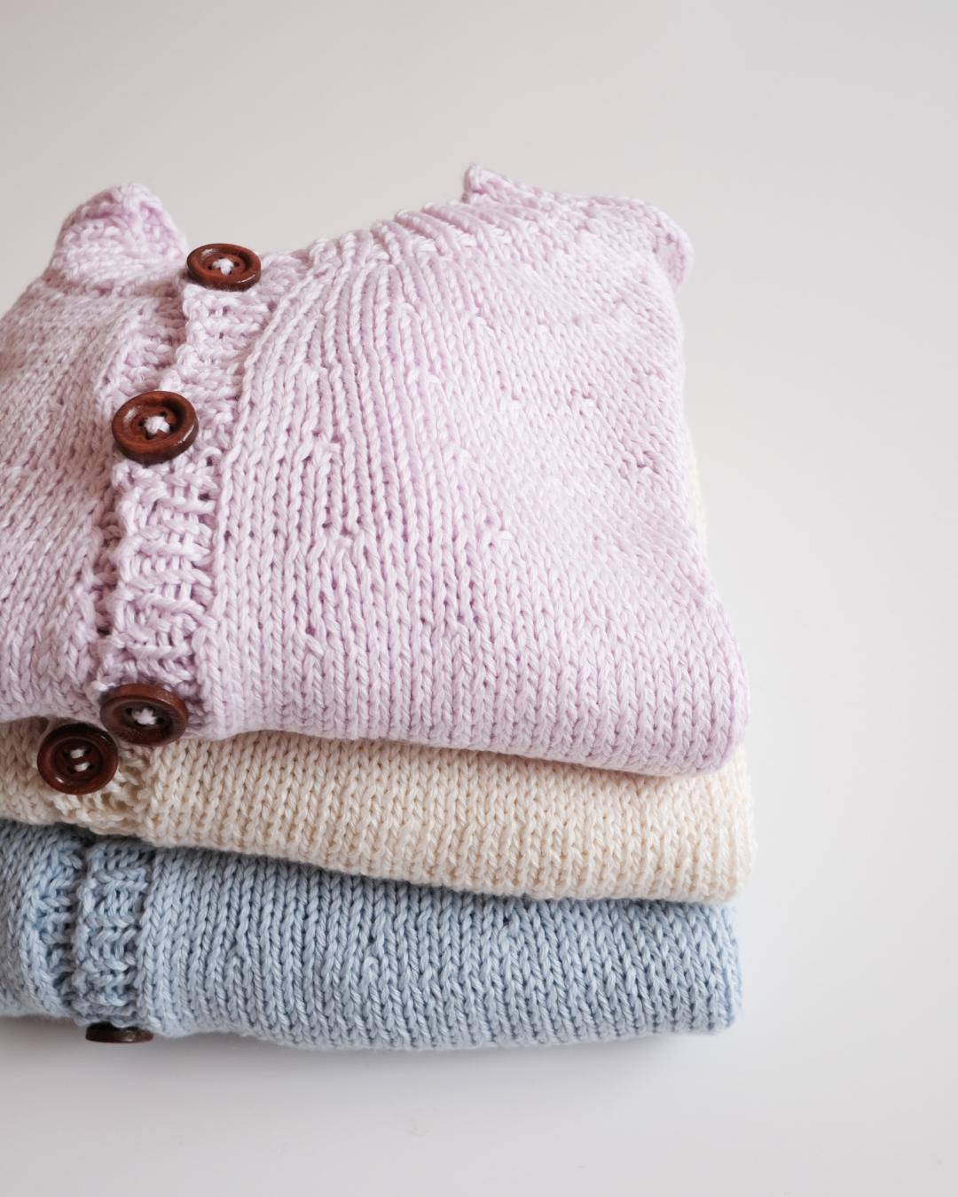 よくある編み方として、カーディガンはパーツごとに編み、その後に全てのパーツをつなげて形にします。