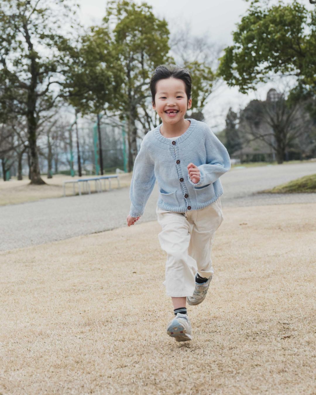 Claraカーディガンを着た我が子の笑顔は、春の日差しよりも眩しく晴れやかです。