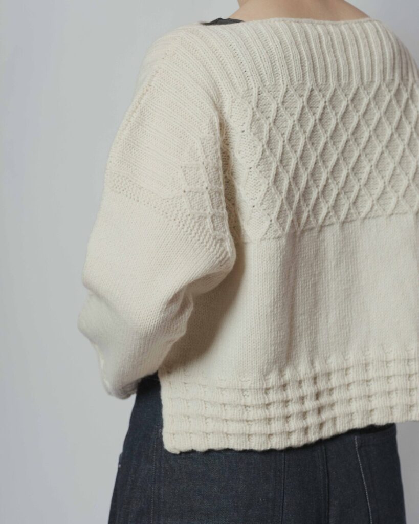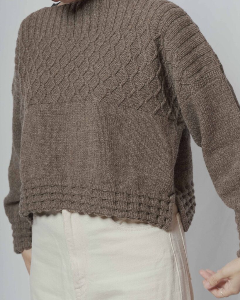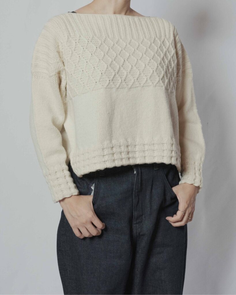 身頃や裾、袖口にあしらわれた模様編みが目を引く、クロップ丈のスタイリッシュなセーターです。