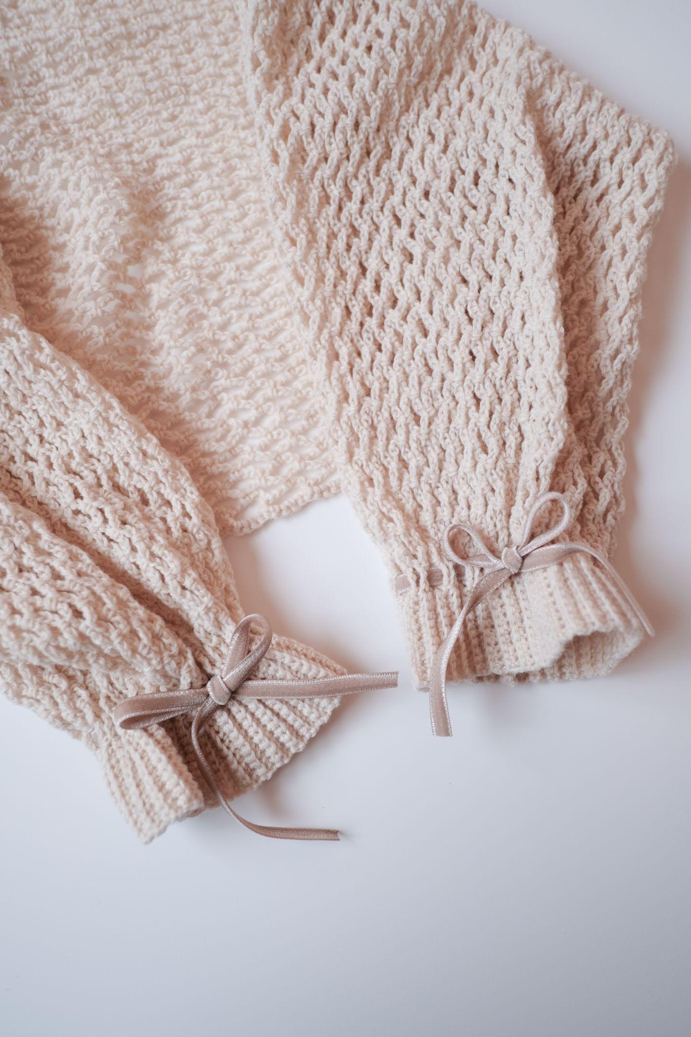 このマーガレットは、袖口はうね編み、袖と身ごろはくさり編みと細編みを組み合わせたネット編みで編んでいきます。