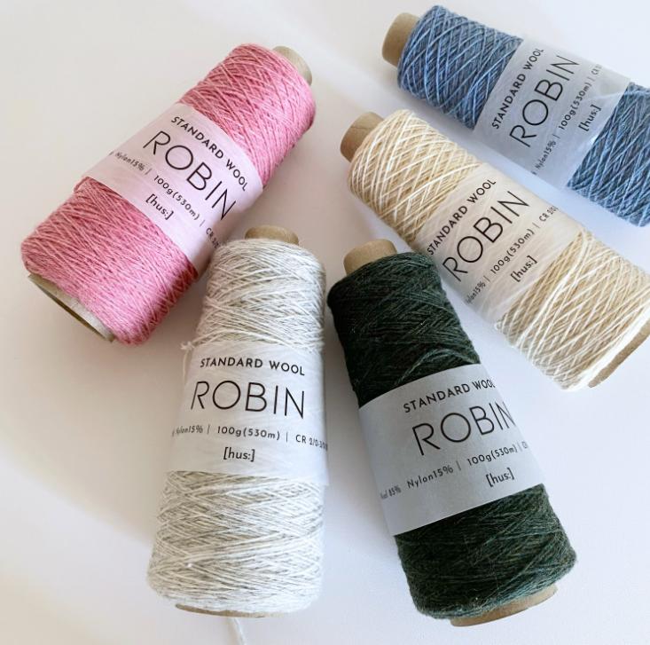 このキットは、ウール85%、ナイロン15%の糸「Robin(ロビン)」で編んでいきます。